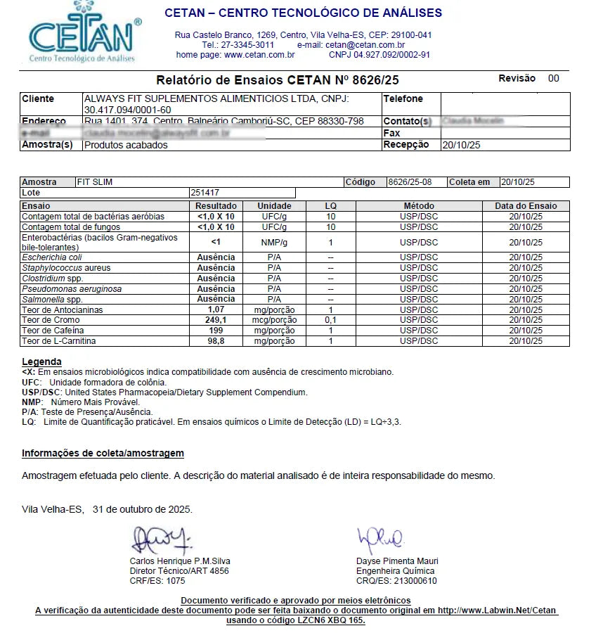 INGREDIENTES: Cafeína, psyllium (Plantago ovatae), espirulina (Arthrospira platensis), tartarato de L-carnitina, extrato de laranja moro (Citrus sinensis L. Osbeck), picolinato de cromo e antiumectante dióxido de silício.