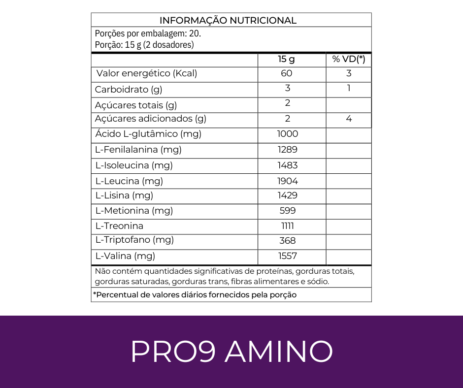Pro9Amino: 1 dosador (15 g) em 200 ml de água antes ou após o treino.